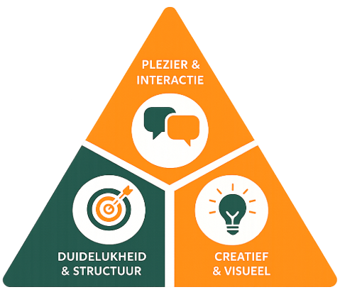 Mijn werkwijze is gebouwd op drie pijlers die samen zorgen voor een leerervaring die niet alleen effectief is, maar ook energie geeft en inspireert.